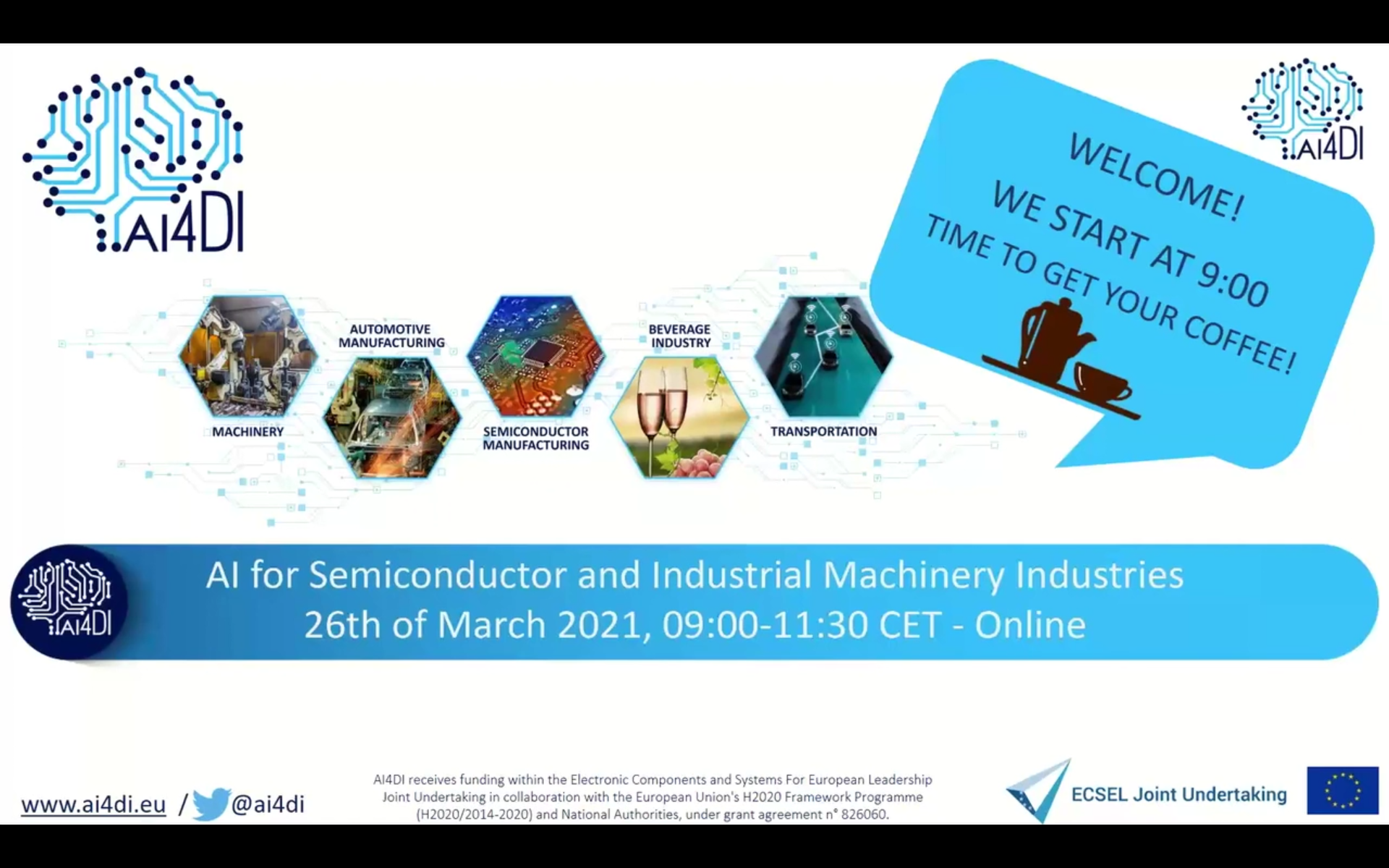 AI4DI consortium partners are happy to show the 2nd Webinar of the AI4DI project. The Webinar presents the topics of artificial intelligence for semiconductor and industrial machinery industries. This Webinar is designed to present the AI techniques and methods used in different applications in the semiconductor industry and industrial machinery developed by AI4DI project partners. The webinar includes a keynote speech from Prof. Wolfgang Ecker, Infineon, Germany.