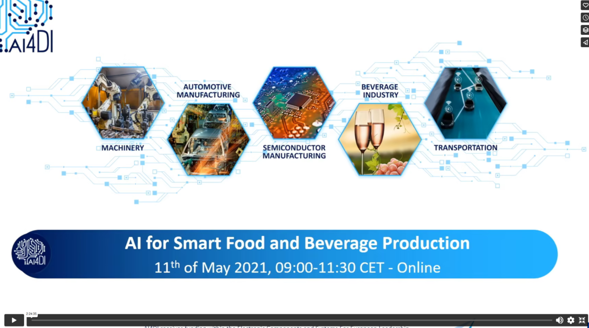 The AI4DI Webinar no3: AI for Smart Food and Beverage Production was designed to present the AI techniques and methods applied to different applications in the food and beverage industry developed by AI4DI project partners. The Webinar includes presentations from other national and European projects.